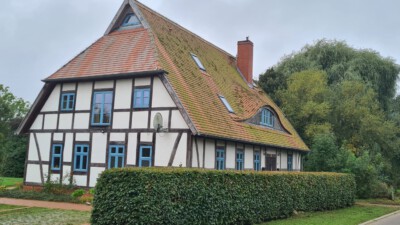 Folgt man dem Straßenschild an der Bundesstraße 194 bei Negast erreicht man nach ca. einem Kilometer den “Eulenhof”. Das Ferienhaus ist ein zweistöckiger Fachwerkbau, der mit Lehm ausgefacht ist. Im unteren Stockwerk befindet sich der große Aufenthaltsraum mit einer offenen Küche, TV und Radio. Weiterhin befindet sich im unteren Stockwerk ein behindertengerechte Schlafzimmer für zwei Personen mit Dusche und WC, zwei separate WC sowie ein kleiner Raum mit Waschmaschine und Trockner. Über eine Treppe erreicht man das zweite Stockwerk mit vier Schlafzimmern (1 x 2, 2 x 3, 1 x 4 Betten) mit jeweils separater Dusche und WC.