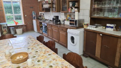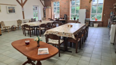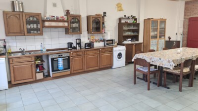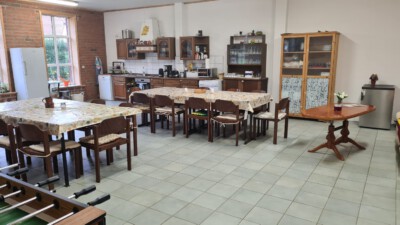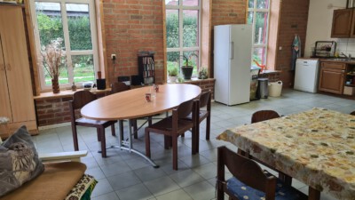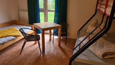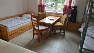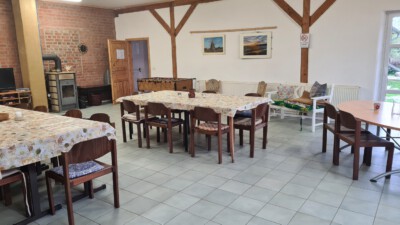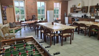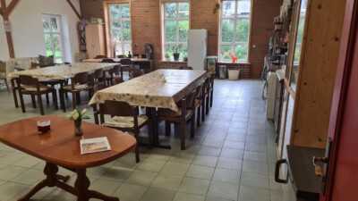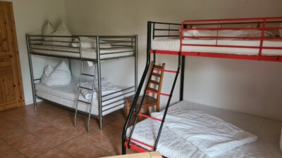 Die Lehmbauhalle wurde um ein Bettenhaus erweitert. Somit stehen hier 6 Zimmer mit insgesamt 33 Betten und einem großen Aufenthaltsraum mit einer Küche für eine Unterbringung von bis zu 20 Erwachsenen bzw. 30 Kindern zur Verfügung. Alles ist per Rollstuhl zu erreichen. Zwei Zimmer wurden rollstuhlgerecht eingerichtet.